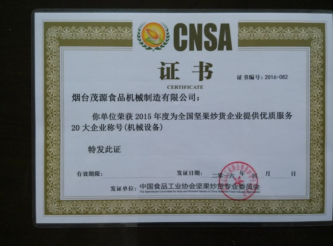 展會(huì)期間,主辦單位還舉辦了全國(guó)堅(jiān)果炒貨行業(yè)國(guó)內(nèi)外新設(shè)備(包裝)、新技術(shù)、新型添加劑、配料等新產(chǎn)品推廣發(fā)布會(huì),發(fā)布了2015-2016年全國(guó)堅(jiān)果炒貨行業(yè)新設(shè)備和新型添加劑的使用分析和預(yù)測(cè)報(bào)告,還有9家中外企業(yè)的11項(xiàng)新設(shè)備(包裝)、新技術(shù)、新型添加劑進(jìn)行了推介發(fā)布。煙臺(tái)茂源食品機(jī)械制造有限公司作為9家中外企業(yè)之一在這次大會(huì)上了做了新設(shè)備的推介發(fā)布,并和現(xiàn)場(chǎng)業(yè)內(nèi)同行進(jìn)行提問互動(dòng)。會(huì)后,舉辦了2015年度全國(guó)堅(jiān)果行業(yè)優(yōu)秀企業(yè)的頒獎(jiǎng)典禮,煙臺(tái)茂源等20個(gè)企業(yè)被評(píng)為2015年度為全國(guó)堅(jiān)果炒貨企業(yè)提供優(yōu)良服務(wù)企業(yè)稱號(hào)。